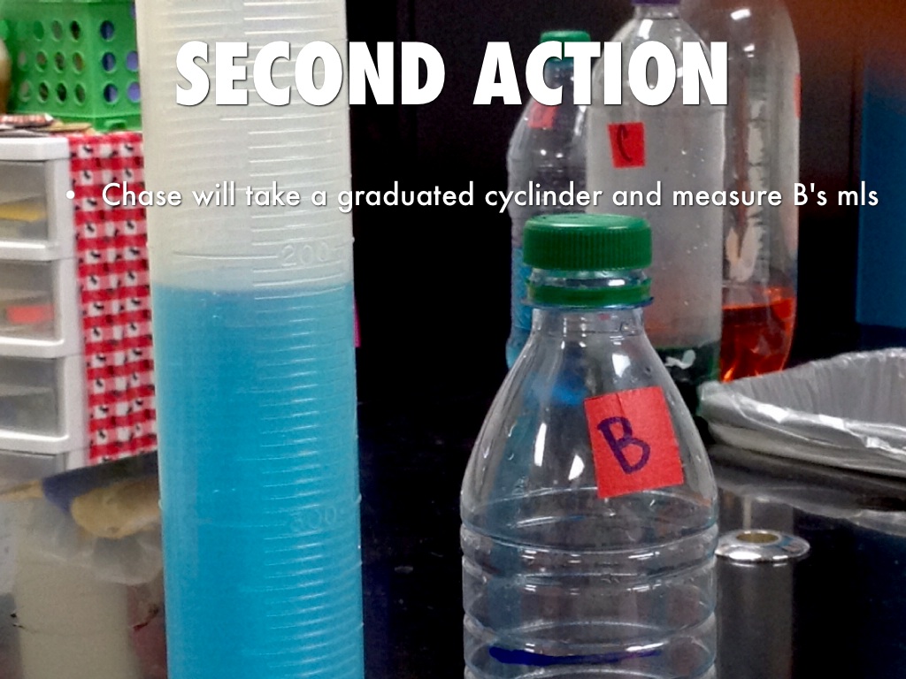 Chase will take a graduated cyclinder and measure B's mls