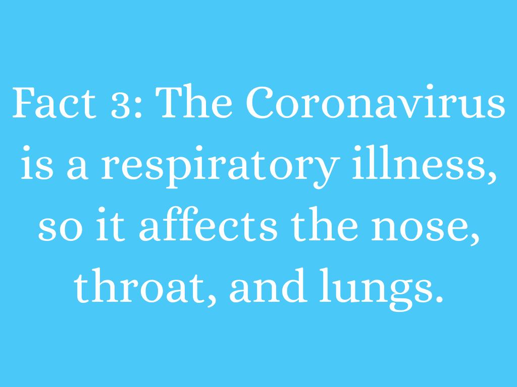 Fact 3: The Coronavirus is a respiratory illness, so it affects the nose, throat, and lungs.
