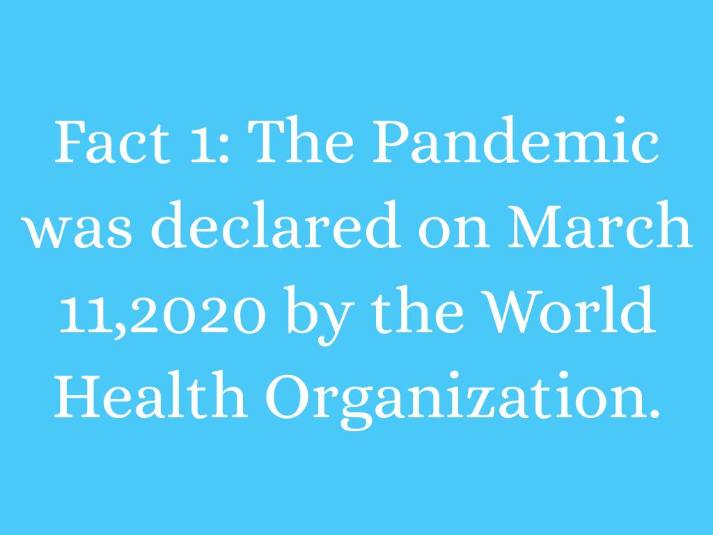Fact 1: The Pandemic was declared on March 11,2020 by the World Health Organization.