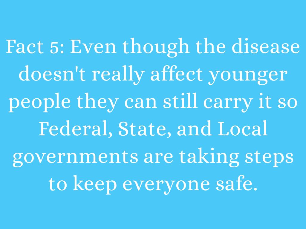Fact 5: Even though the disease doesn't really affect younger people they can still carry it so Federal, State, and Local governments are taking steps to keep everyone safe.