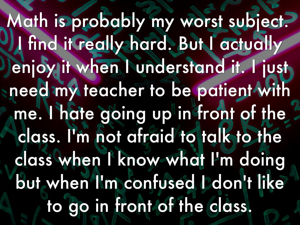 Math is probably my worst subject. I find it really hard. But I actually enjoy it when I understand it. I just need my teacher to be patient with me. I hate going up in front of the class. I'm not afraid to talk to the class when I know what I'm doing but when I'm confused I don't like to go in front of the class.