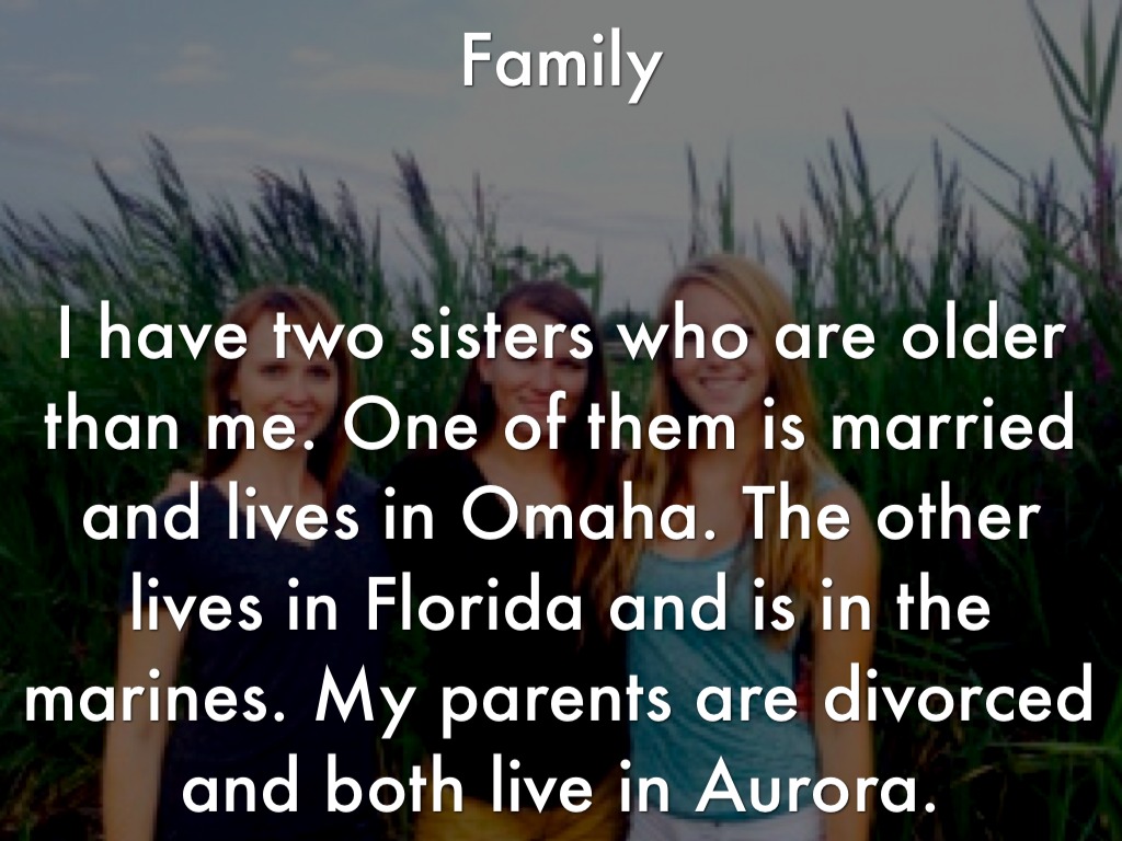 I have two sisters who are older than me. One of them is married and lives in Omaha. The other lives in Florida and is in the marines. My parents are divorced and both live in Aurora.