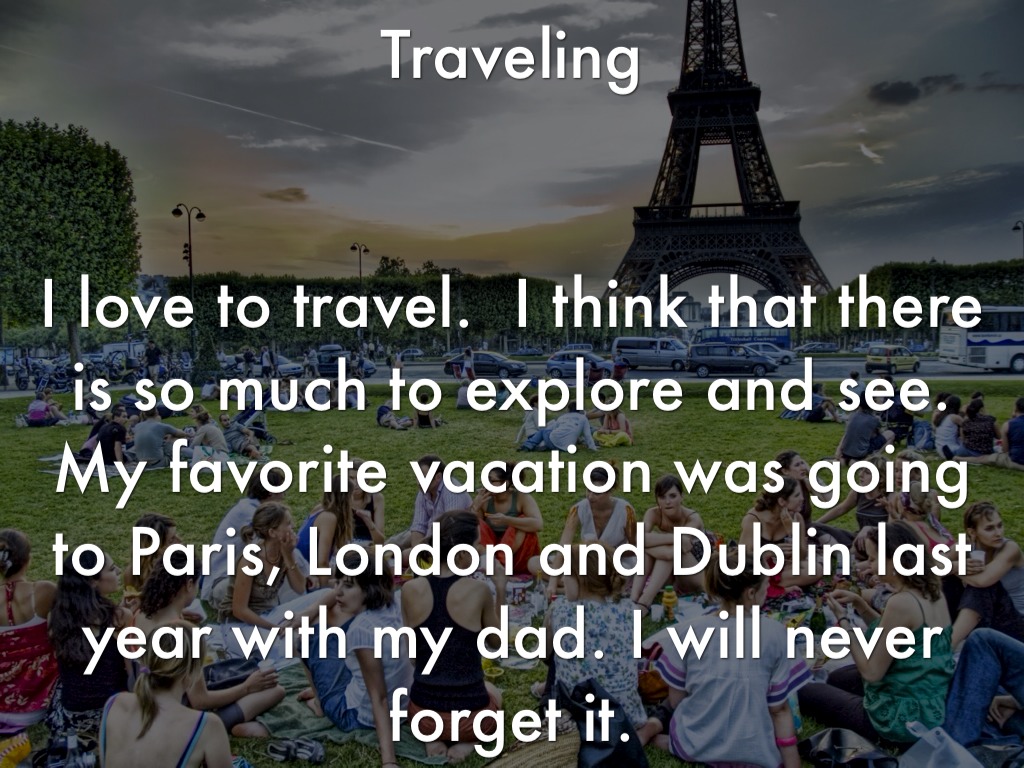 I love to travel. I think that there is so much to explore and see. My favorite vacation was going to Paris, London and Dublin last year with my dad. I will never forget it.