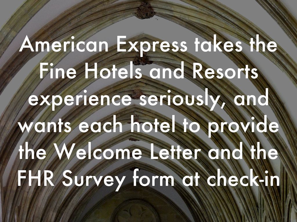 American Express takes the Fine Hotels and Resorts experience seriously, and wants each hotel to provide the Welcome Letter and the FHR Survey form at check-in