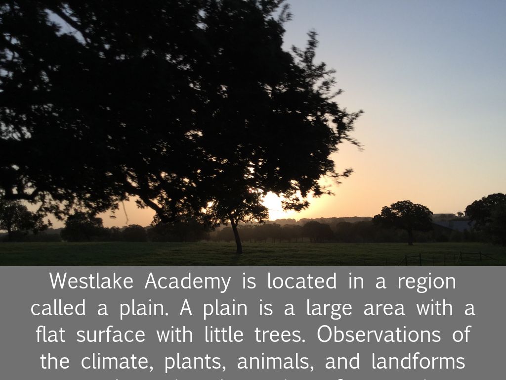 Westlake Academy is located in a region called a plain. A plain is a large area with a flat surface with little trees. Observations of the climate, plants, animals, and landforms are determine the region of a certain location.
