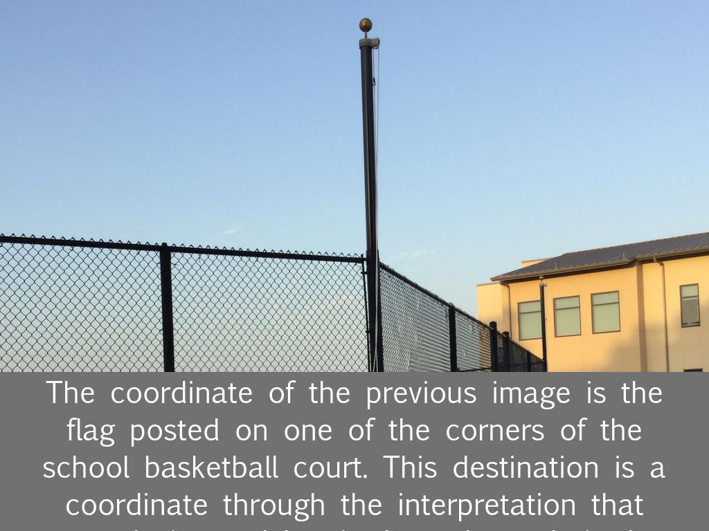 The coordinate of the previous image is the flag posted on one of the corners of the school basketball court. This destination is a coordinate through the interpretation that one designated longitude and one latitude intersect at that point.