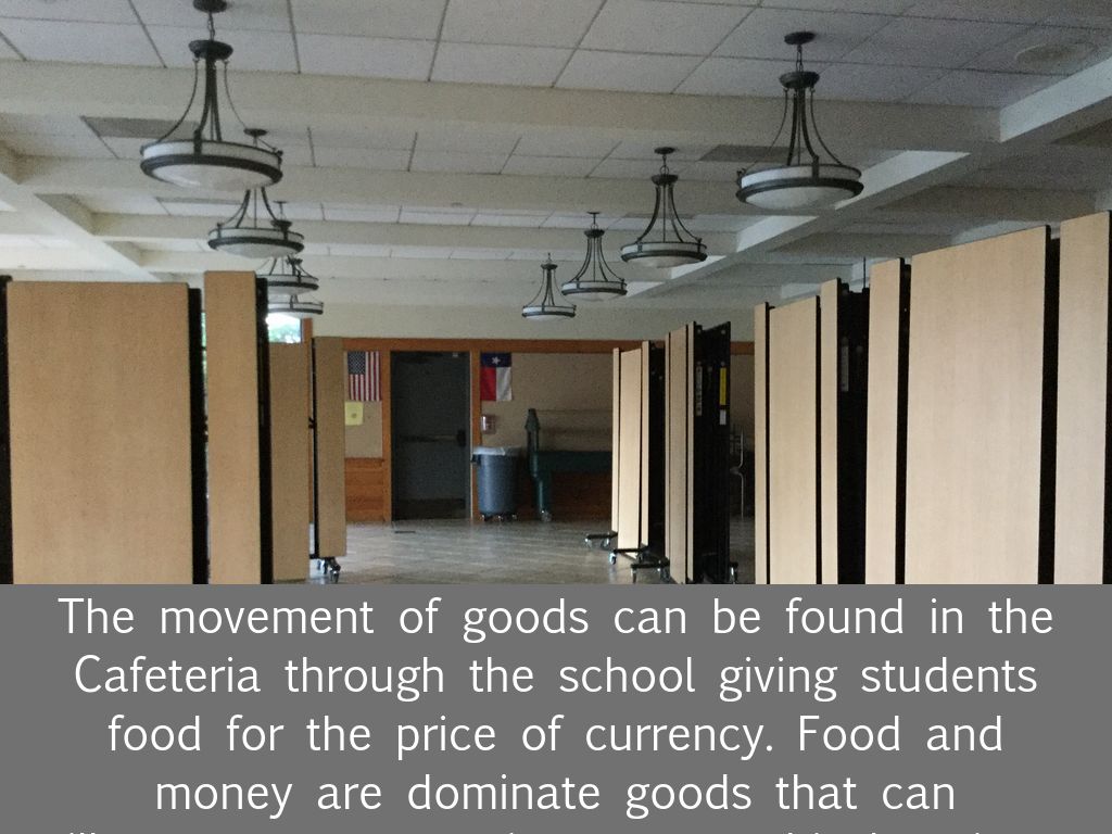 The movement of goods can be found in the Cafeteria through the school giving students food for the price of currency. Food and money are dominate goods that can illustrate movement in a geographic location.