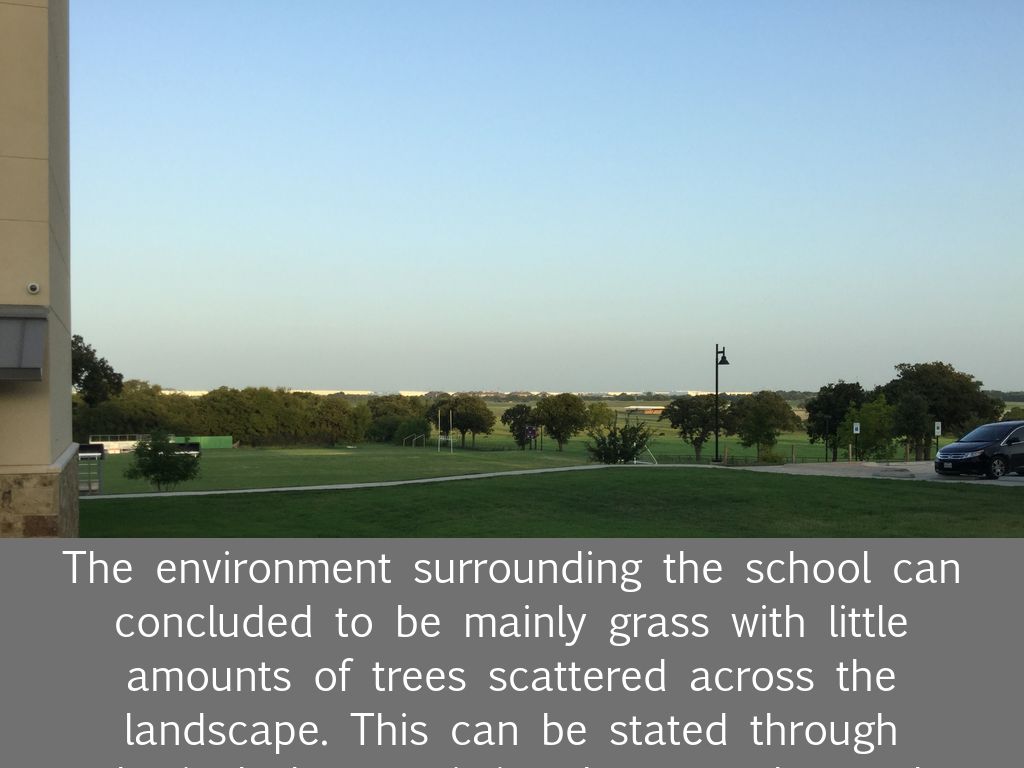 The environment surrounding the school can concluded to be mainly grass with little amounts of trees scattered across the landscape. This can be stated through physical characteristics that are observed. Including living organisms and landforms that are located nearby. For example, the domain has countless trees and open grass that can clearly demonstrate that the territory is a plain.