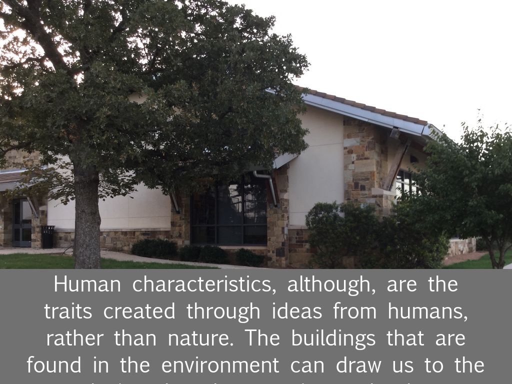 Human characteristics, although, are the traits created through ideas from humans, rather than nature. The buildings that are found in the environment can draw us to the conclusion that the area is a school zone through the countless classrooms, playground, and sport related areas on the campus.