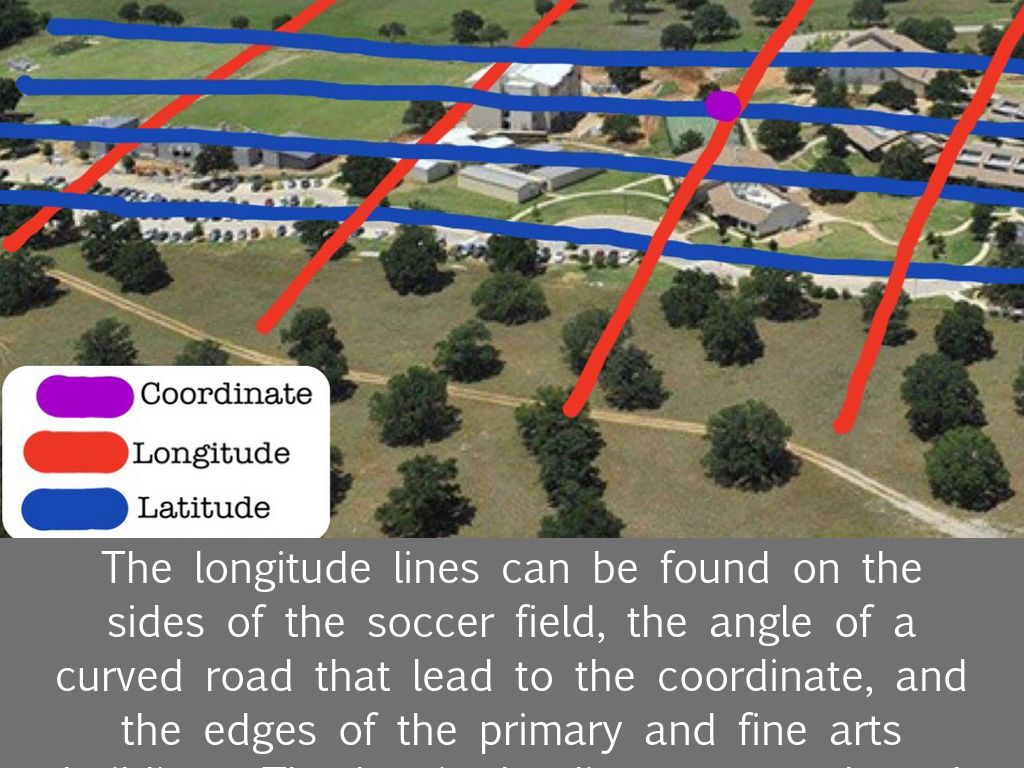 The longitude lines can be found on the sides of the soccer field, the angle of a curved road that lead to the coordinate, and the edges of the primary and fine arts buildings. The longitudes lines run north and south of the school campus.