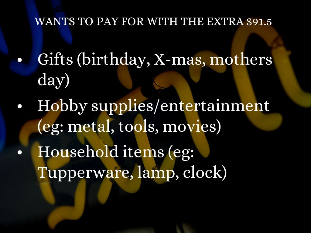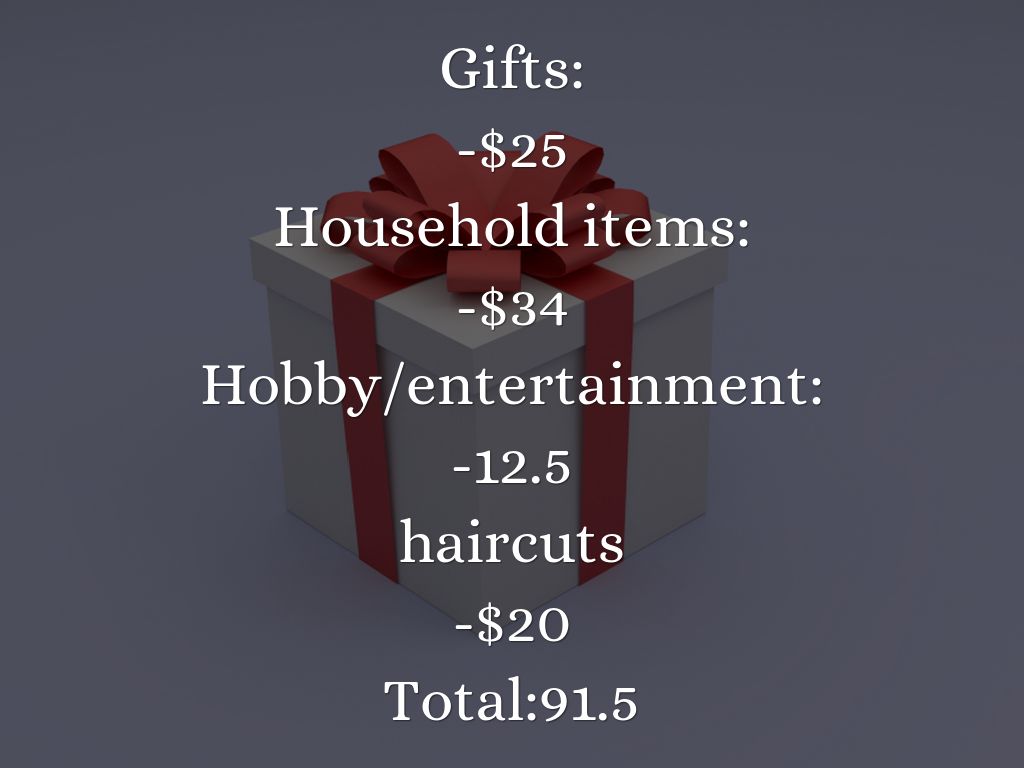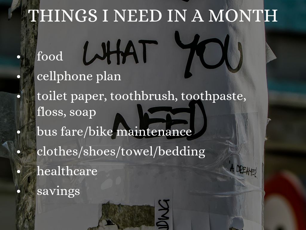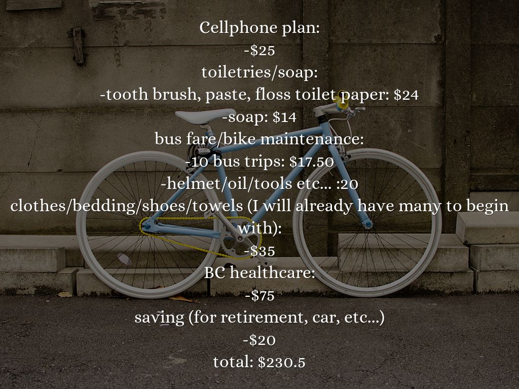 Cellphone plan: -$25 toiletries/soap: -tooth brush, paste, floss toilet paper: $24 -soap: $14 bus fare/bike maintenance: -10 bus trips: $17.50 -helmet/oil/tools etc... :20 clothes/bedding/shoes/towels (I will already have many to begin with): -$35 BC healthcare: -$75 saving (for retirement, car, etc...) -$20 total: $230.5