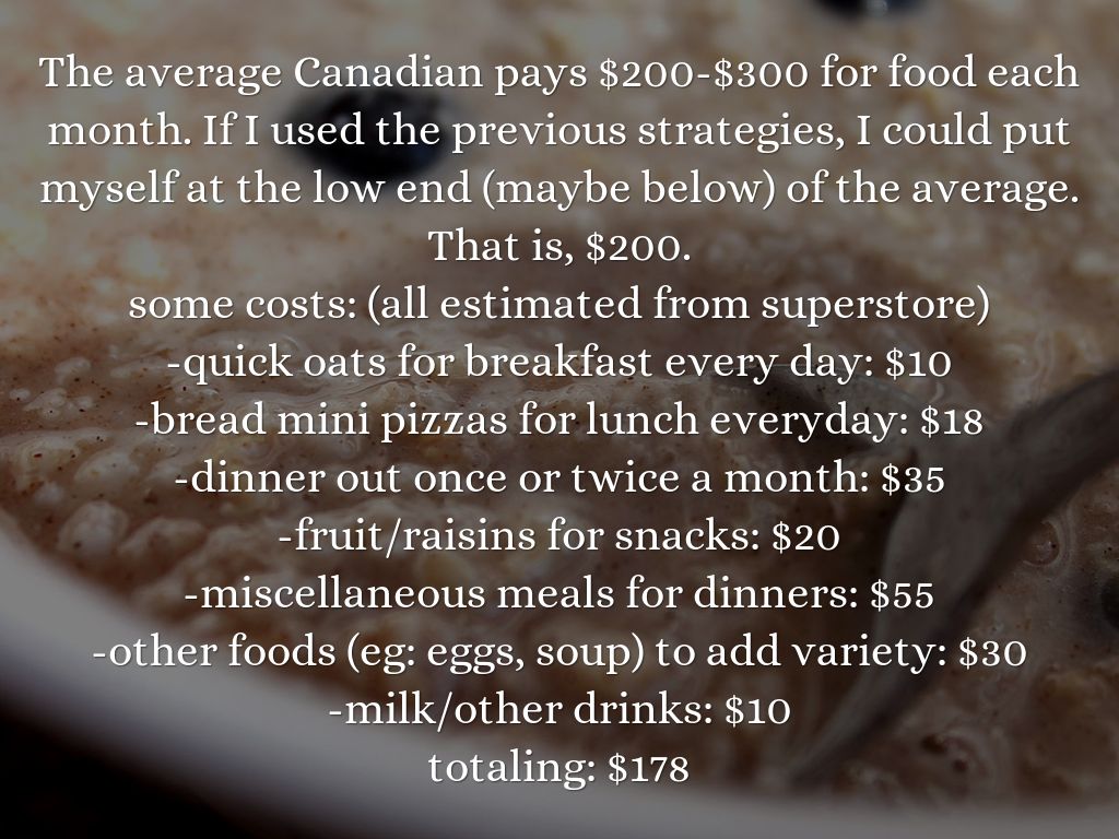 The average Canadian pays $200-$300 for food each month. If I used the previous strategies, I could put myself at the low end (maybe below) of the average. That is, $200. some costs: (all estimated from superstore) -quick oats for breakfast every day: $10 -bread mini pizzas for lunch everyday: $18 -dinner out once or twice a month: $35 -fruit/raisins for snacks: $20 -miscellaneous meals for dinners: $55 -other foods (eg: eggs, soup) to add variety: $30 -milk/other drinks: $10 totaling: $178