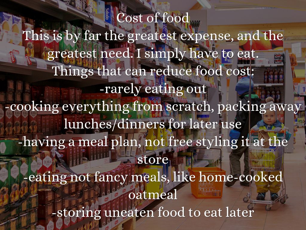 Cost of food This is by far the greatest expense, and the greatest need. I simply have to eat. Things that can reduce food cost: -rarely eating out -cooking everything from scratch, packing away lunches/dinners for later use -having a meal plan, not free styling it at the store -eating not fancy meals, like home-cooked oatmeal -storing uneaten food to eat later