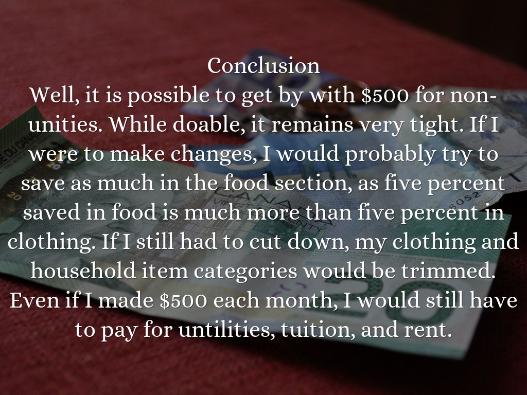 Conclusion Well, it is possible to get by with $500 for non-unities. While doable, it remains very tight. If I were to make changes, I would probably try to save as much in the food section, as five percent saved in food is much more than five percent in clothing. If I still had to cut down, my clothing and household item categories would be trimmed. Even if I made $500 each month, I would still have to pay for untilities, tuition, and rent.