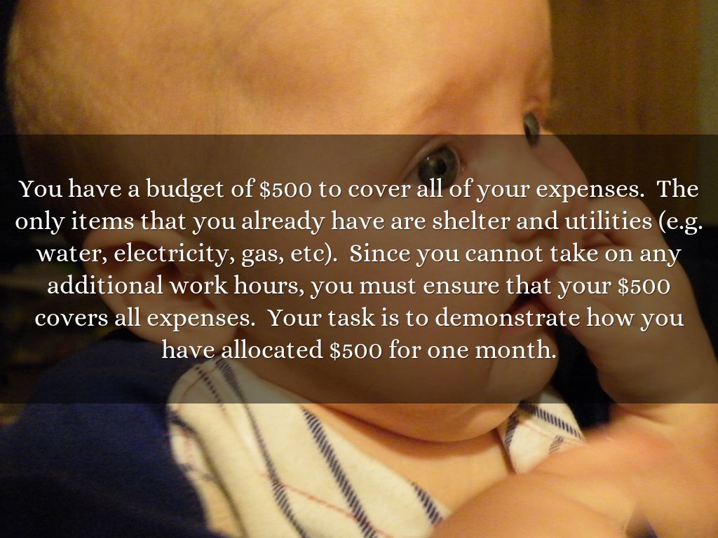 You have a budget of $500 to cover all of your expenses. The only items that you already have are shelter and utilities (e.g. water, electricity, gas, etc). Since you cannot take on any additional work hours, you must ensure that your $500 covers all expenses. Your task is to demonstrate how you have allocated $500 for one month.