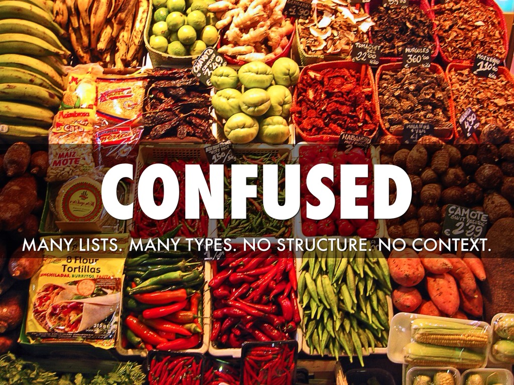 MANY LISTS. MANY TYPES. NO STRUCTURE. NO CONTEXT.