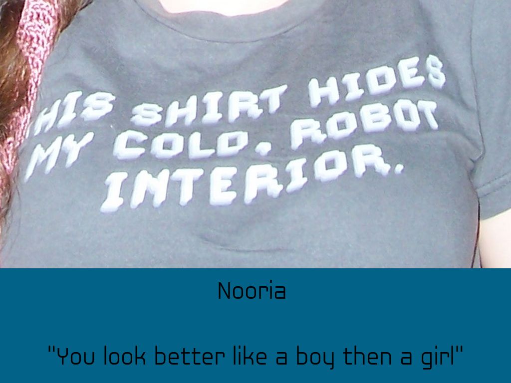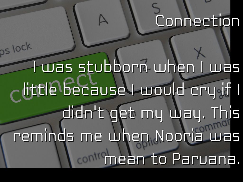 I was stubborn when I was little because I would cry if I didn't get my way. This reminds me when Nooria was mean to Parvana.