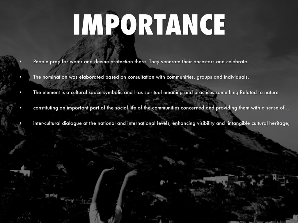 The element is a cultural space symbolic and Has spiritual meaning and practices something Related to nature