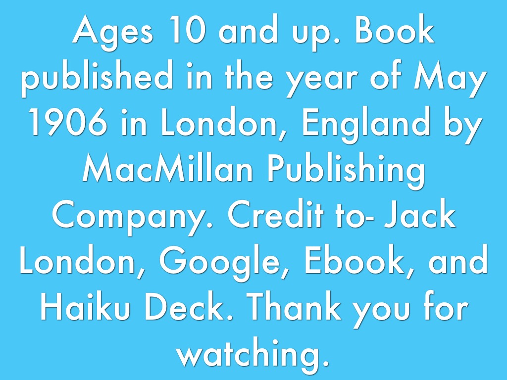 Ages 10 and up. Book published in the year of May 1906 in London, England by MacMillan Publishing Company. Credit to- Jack London, Google, Ebook, and Haiku Deck. Thank you for watching.