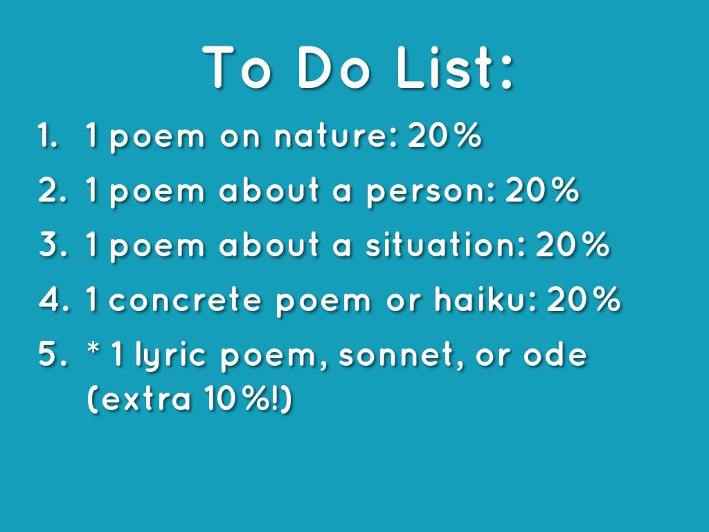 • * 1 lyric poem, sonnet, or ode (extra! 10%!)