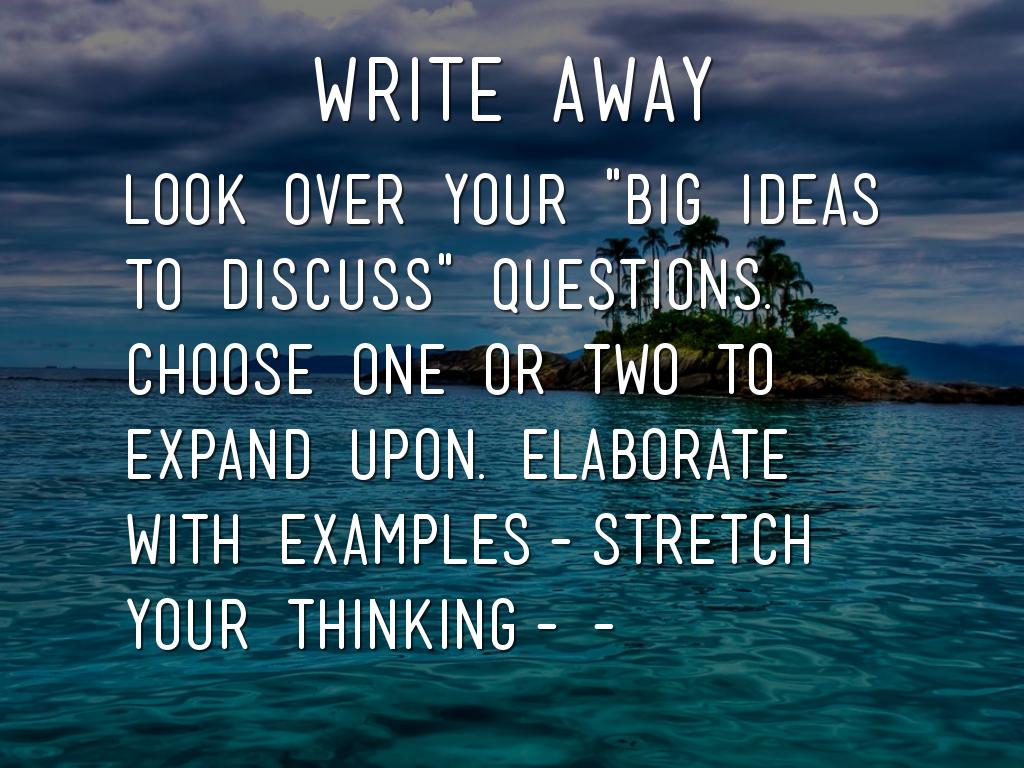 look over your "BIG IDEAS TO DISCUSS" questions. choose one or two to expand upon. elaborate with examples-stretch your thinking--