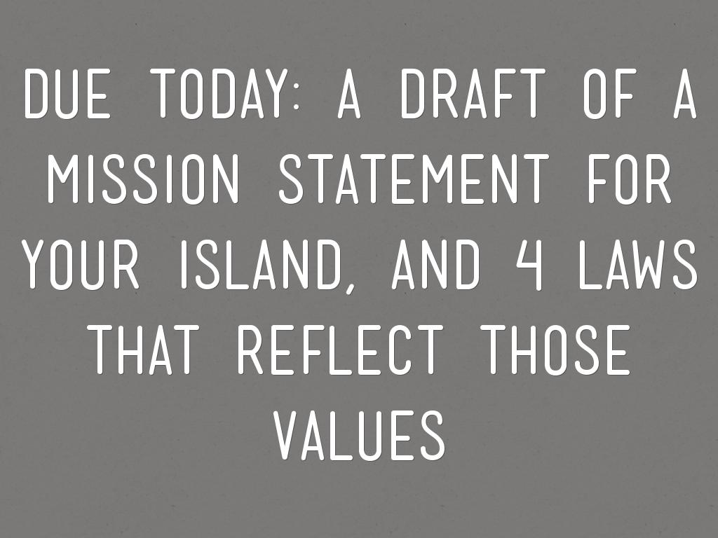 due today: a draft of a mission statement for your island, and 4 laws that reflect those values