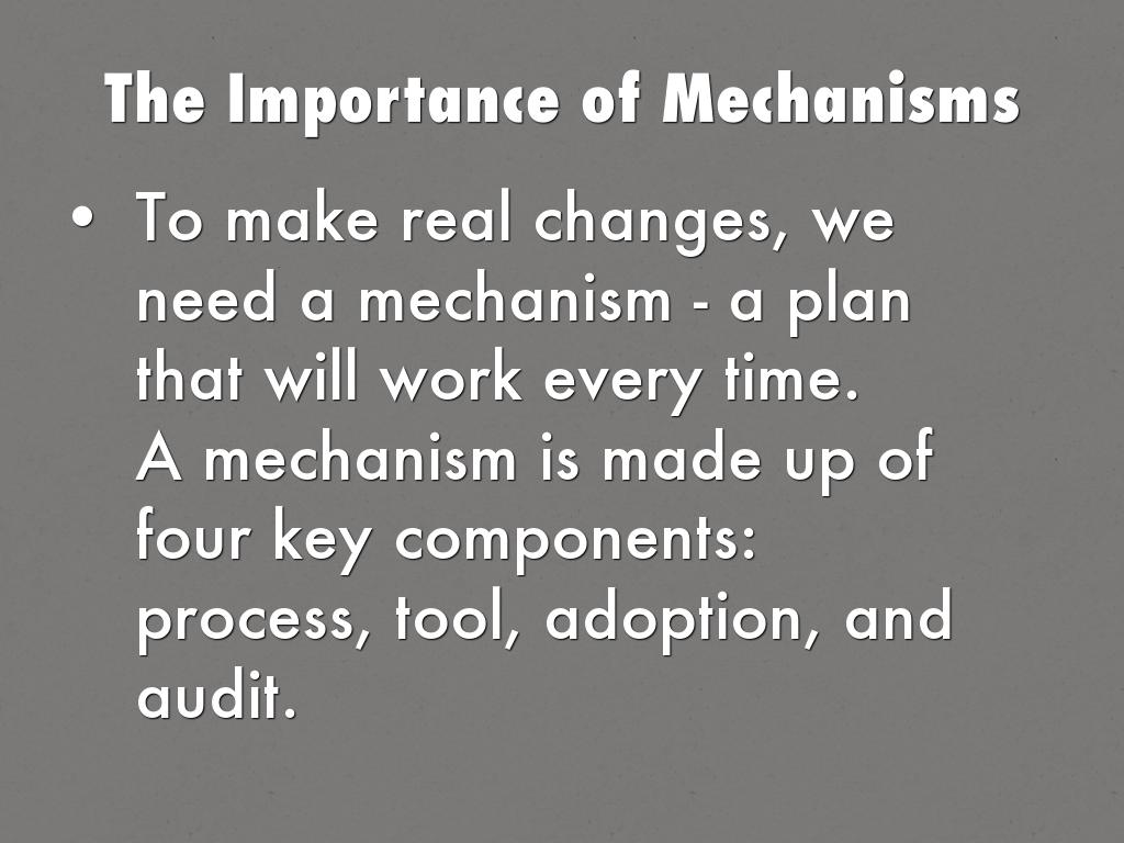 A mechanism is made up of four key components: process, tool, adoption, and audit.