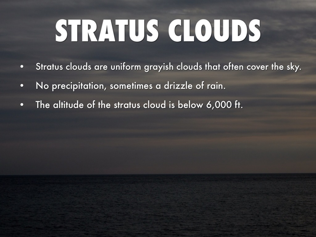 Stratus clouds are uniform grayish clouds that often cover the sky.