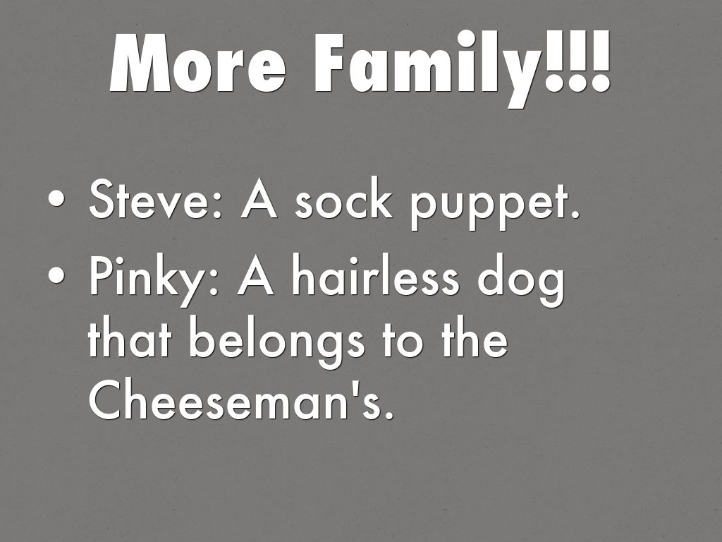 - Pinky: A hairless dog that belongs to the Cheeseman's.