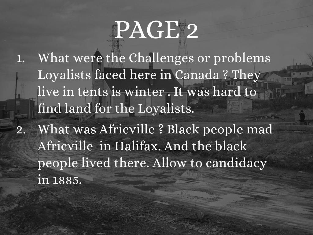Life was very hard for the black loyalists in Africville ? this is why and how . The black people living in Africville had to give up there homes. Then Africville was demolished to build a bridge.