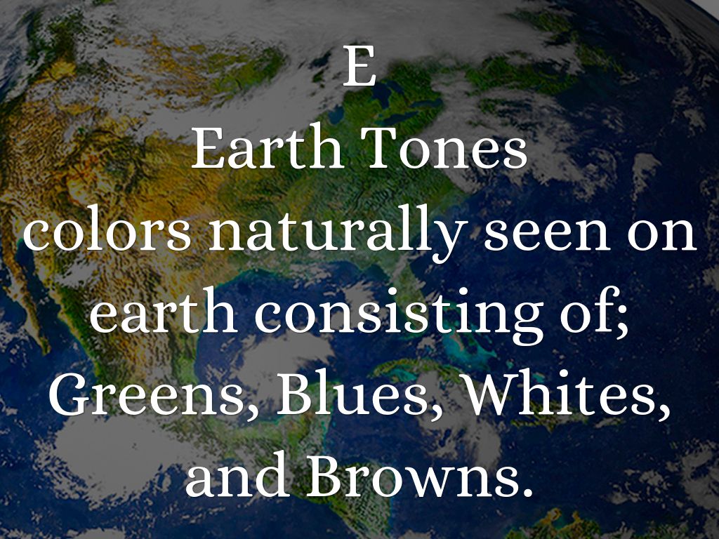 colors naturally seen on earth consisting of; Greens, Blues, Whites, and Browns.