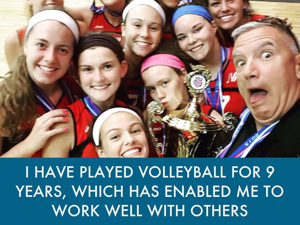 I HAVE PLAYED VOLLEYBALL FOR 9 YEARS, WHICH HAS ENABLED ME TO WORK WELL WITH OTHERS