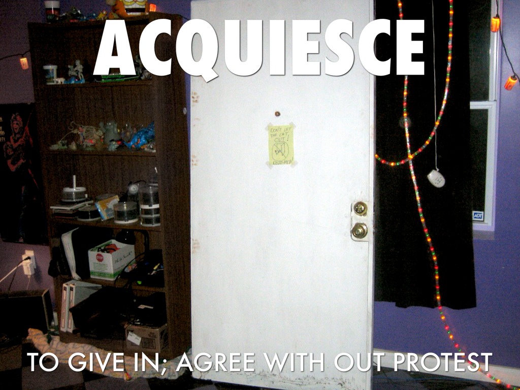 TO GIVE IN; AGREE WITH OUT PROTEST