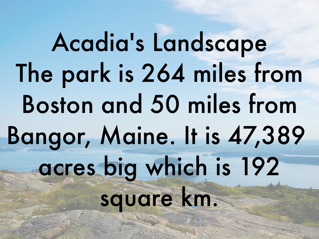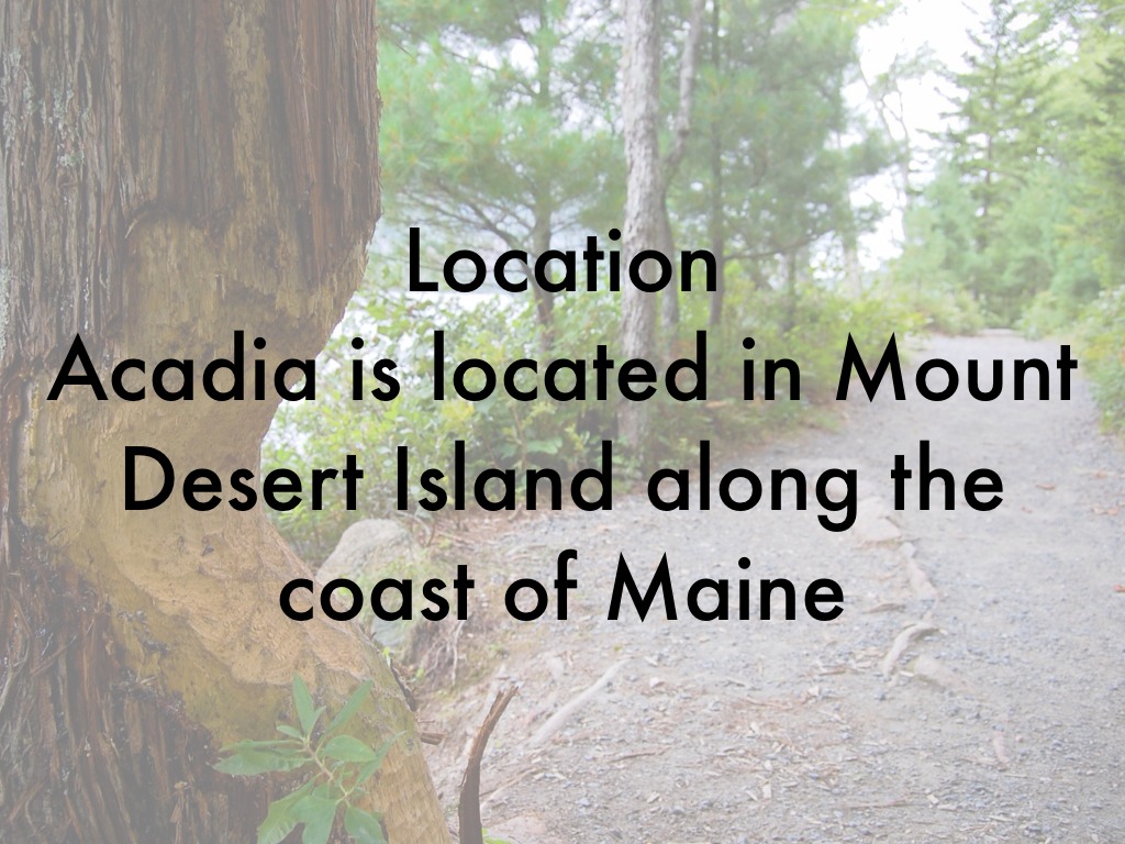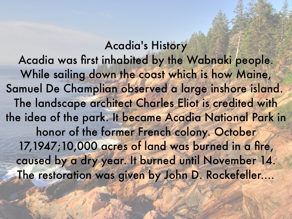 Acadia's History Acadia was first inhabited by the Wabnaki people. While sailing down the coast which is how Maine, Samuel De Champlian observed a large inshore island. The landscape architect Charles Eliot is credited with the idea of the park. It became Acadia National Park in honor of the former French colony. October 17,1947;10,000 acres of land was burned in a fire, caused by a dry year. It burned until November 14. The restoration was given by John D. Rockefeller.