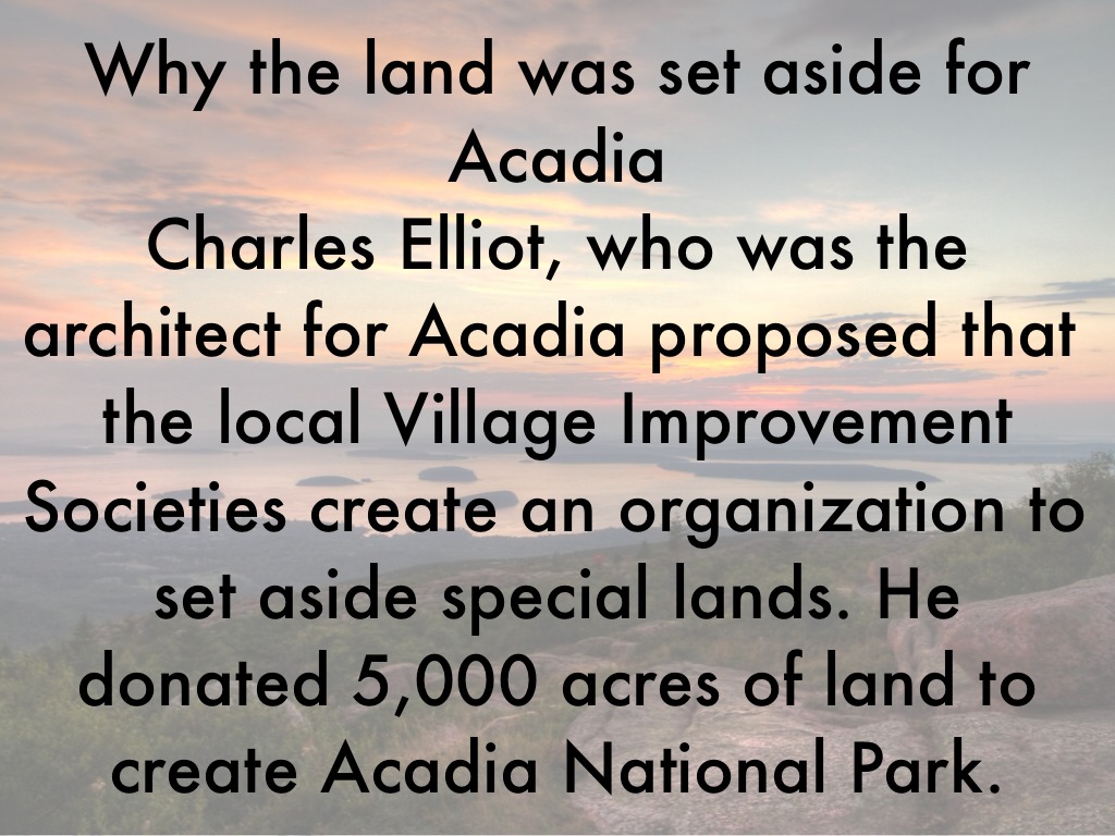 Why the land was set aside for Acadia Charles Elliot, who was the architect for Acadia proposed that the local Village Improvement Societies create an organization to set aside special lands. He donated 5,000 acres of land to create Acadia National Park.