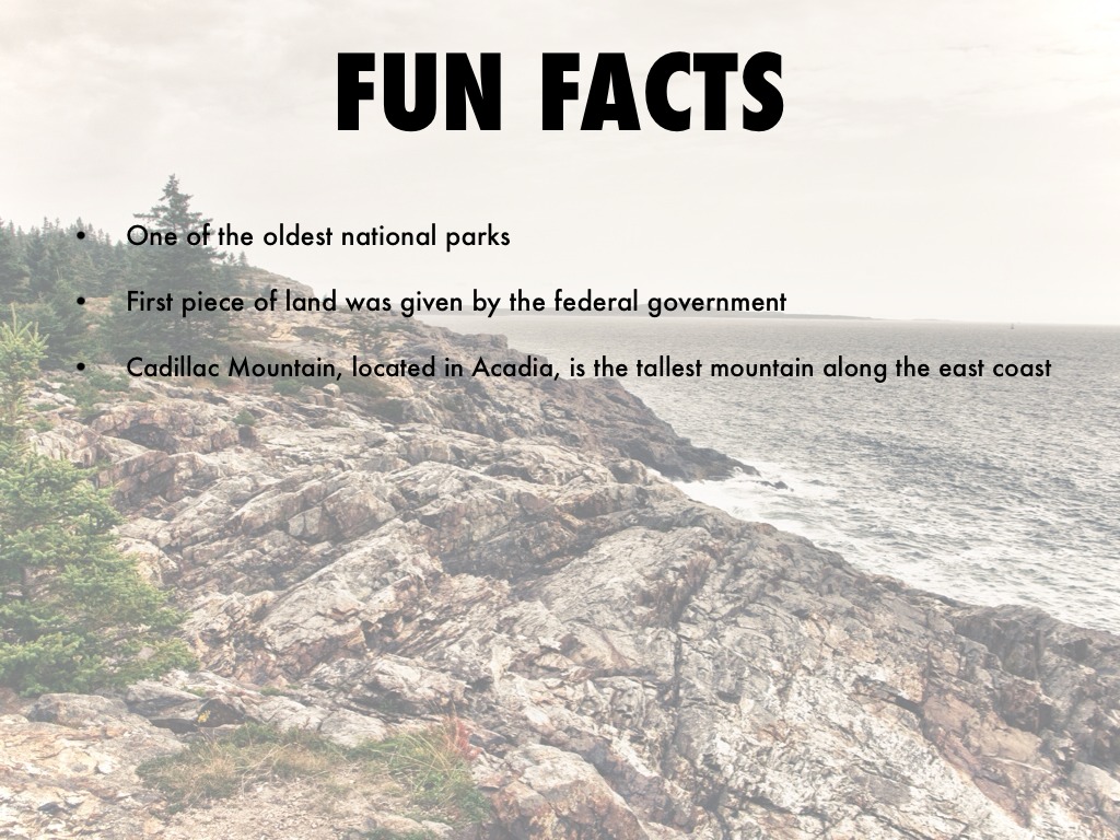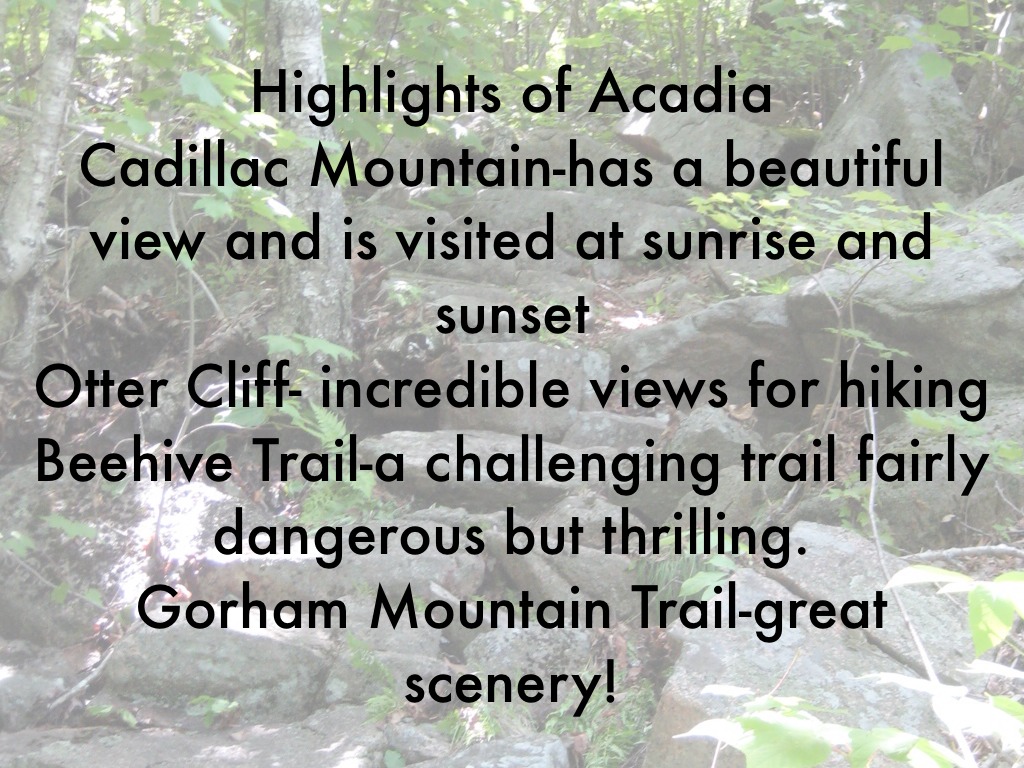 Highlights of Acadia Cadillac Mountain-has a beautiful view and is visited at sunrise and sunset Otter Cliff- incredible views for hiking Beehive Trail-a challenging trail fairly dangerous but thrilling. Gorham Mountain Trail-great scenery!