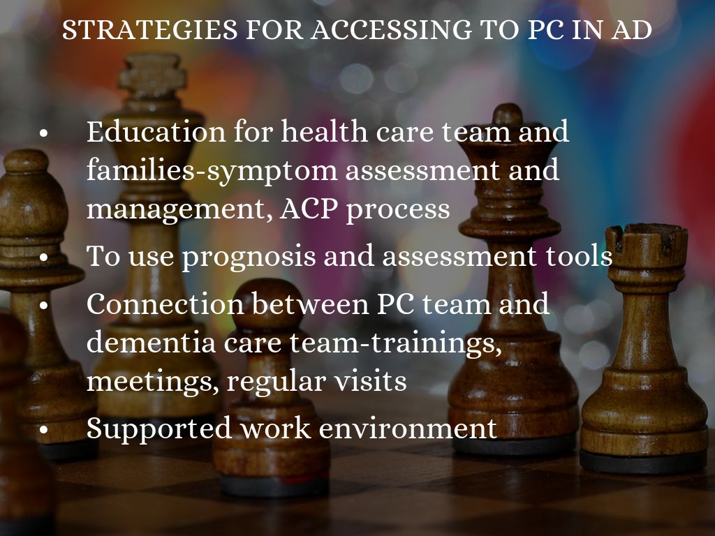 Education of AD and PC, ACP process for a health care team is to improve timely introducing ACP, appropriate prognosis, assessment and management skills, timely introducing palliative care approach, timely referral to a palliative care team, a quality of palliative care.