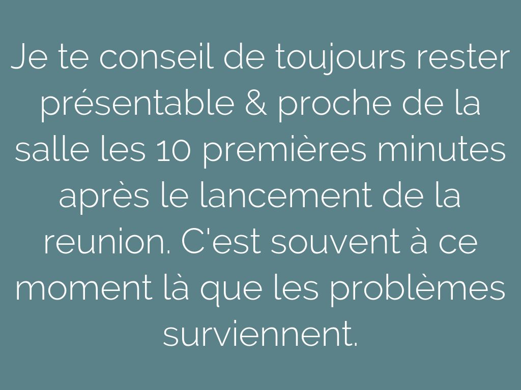Je te conseil de toujours rester présentable & proche de la salle les 10 premières minutes après le lancement de la reunion. C'est souvent à ce moment là que les problèmes surviennent.