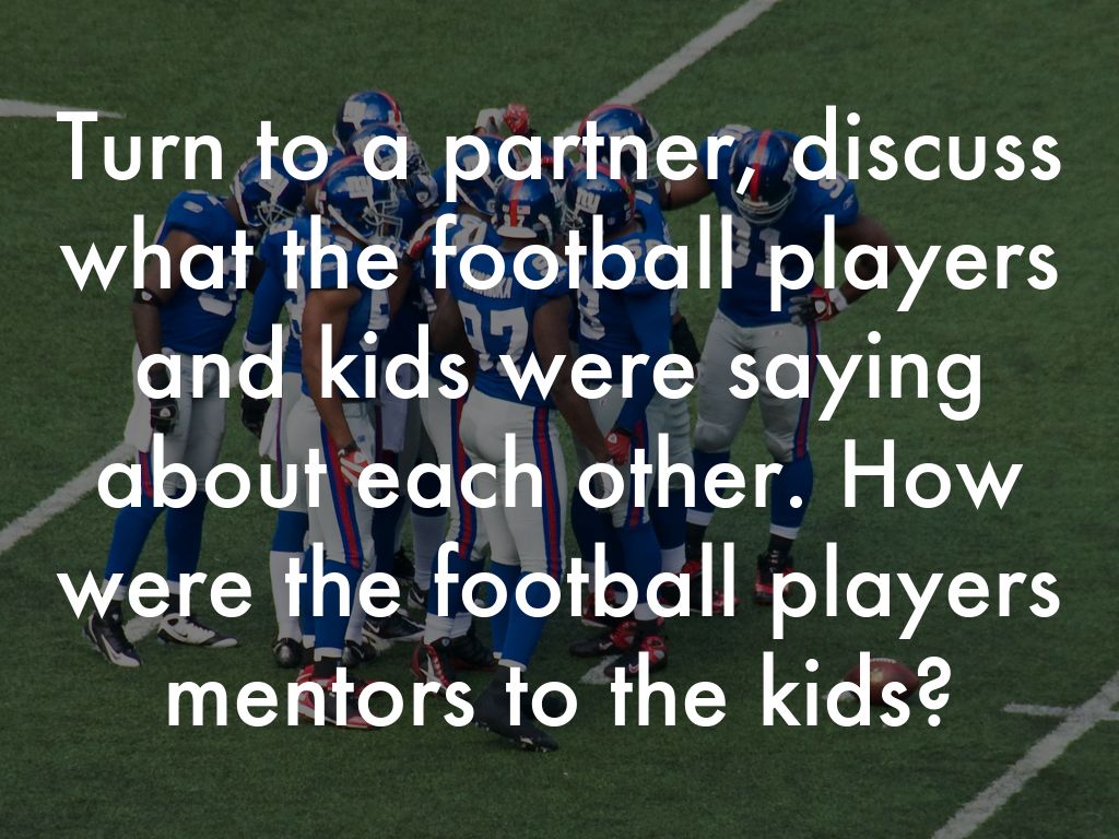Turn to a partner, discuss what the football players and kids were saying about each other. How were the football players mentors to the kids?