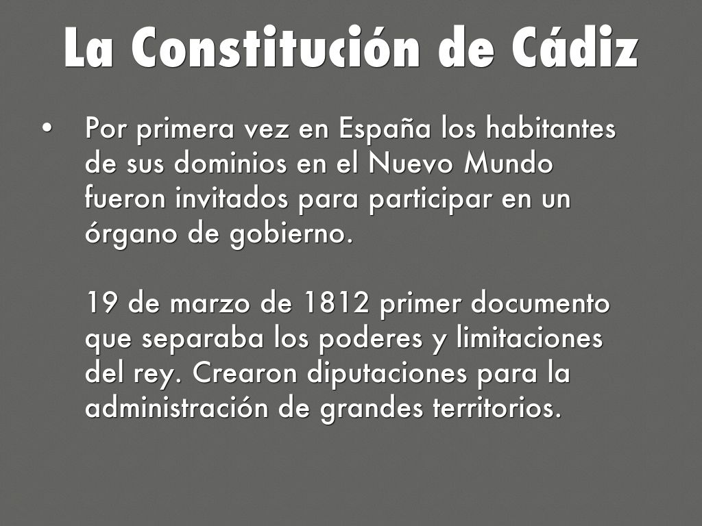 19 de marzo de 1812 primer documento que separaba los poderes y limitaciones del rey. Crearon diputaciones para la administración de grandes territorios.