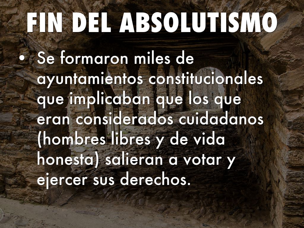 Se formaron miles de ayuntamientos constitucionales que implicaban que los que eran considerados cuidadanos (hombres libres y de vida honesta) salieran a votar y ejercer sus derechos.