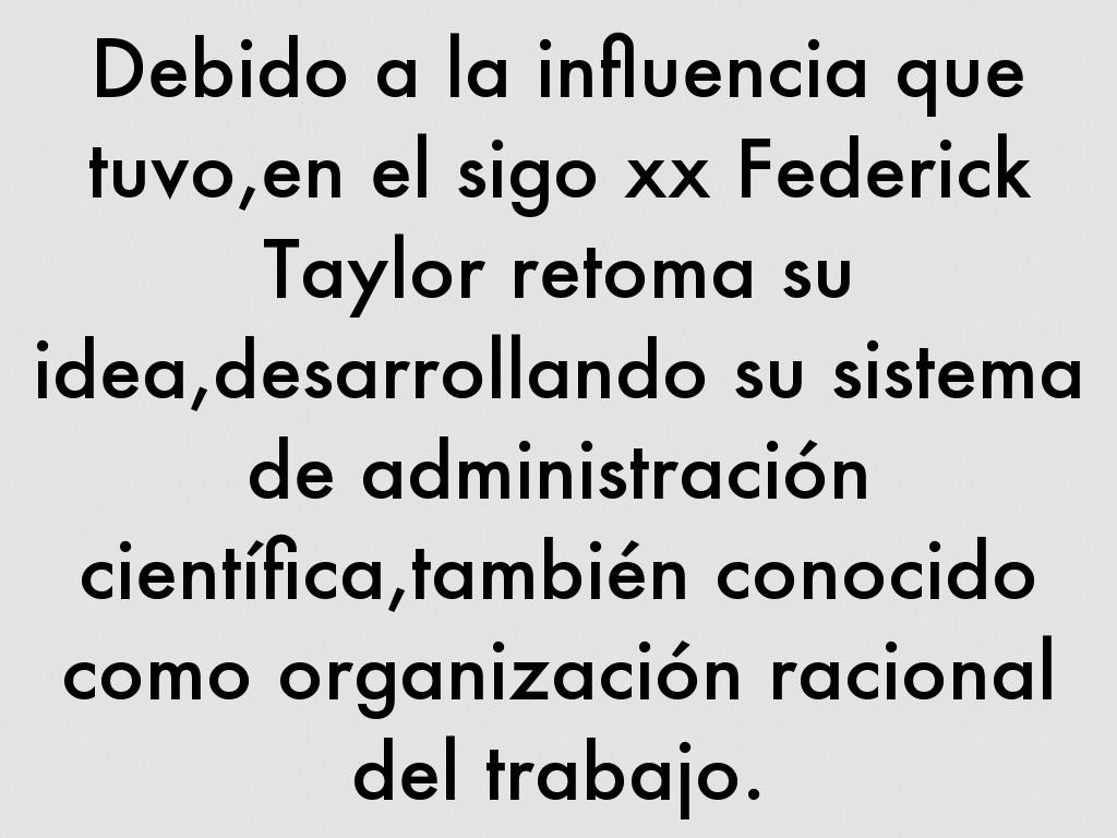 Debido a la influencia que tuvo,en el sigo xx Federick Taylor retoma su idea,desarrollando su sistema de administración científica,también conocido como organización racional del trabajo.