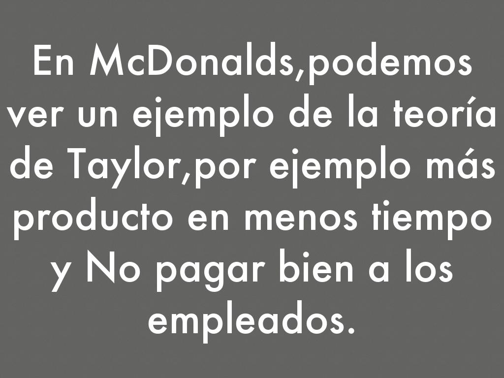 En McDonalds,podemos ver un ejemplo de la teoría de Taylor,por ejemplo más producto en menos tiempo y No pagar bien a los empleados.
