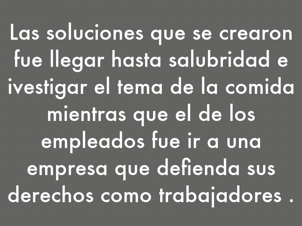 Las soluciones que se crearon fue llegar hasta salubridad e ivestigar el tema de la comida mientras que el de los empleados fue ir a una empresa que defienda sus derechos como trabajadores .