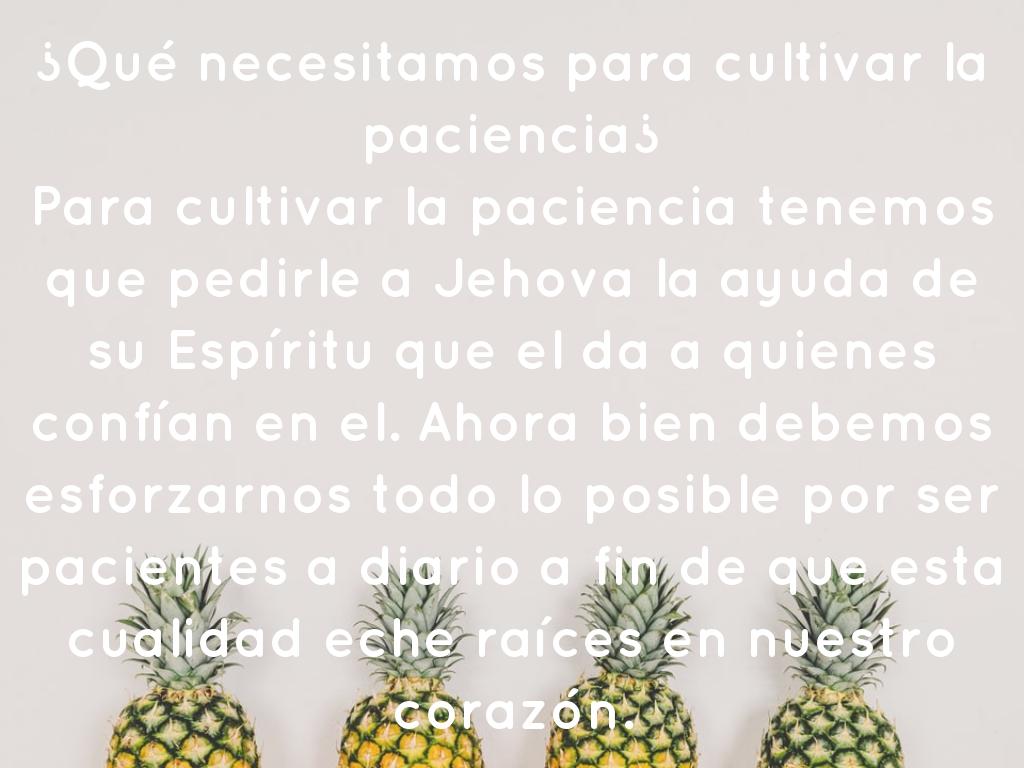 Para cultivar la paciencia tenemos que pedirle a Jehova la ayuda de su Espíritu que el da a quienes confían en el. Ahora bien debemos esforzarnos todo lo posible por ser pacientes a diario a fin de que esta cualidad eche raíces en nuestro corazón.