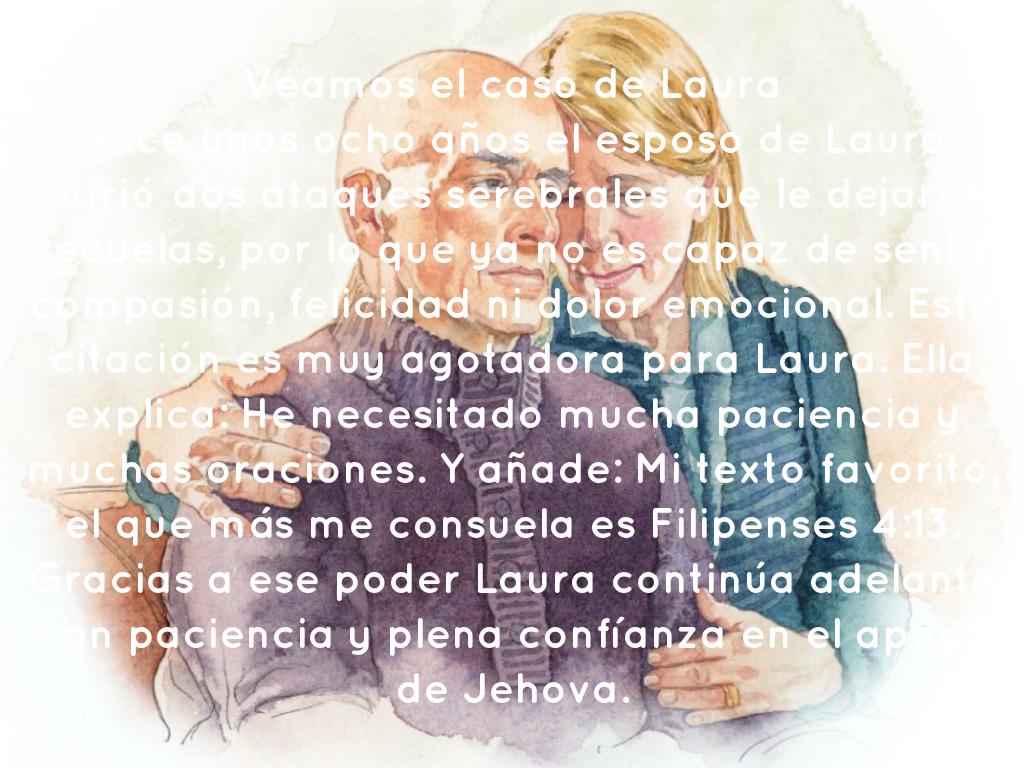Hace unos ocho años el esposo de Laura sufrió dos ataques serebrales que le dejaron secuelas, por lo que ya no es capaz de sentir compasión, felicidad ni dolor emocional. Esta citación es muy agotadora para Laura. Ella explica: He necesitado mucha paciencia y muchas oraciones. Y añade: Mi texto favorito, el que más me consuela es Filipenses 4:13.