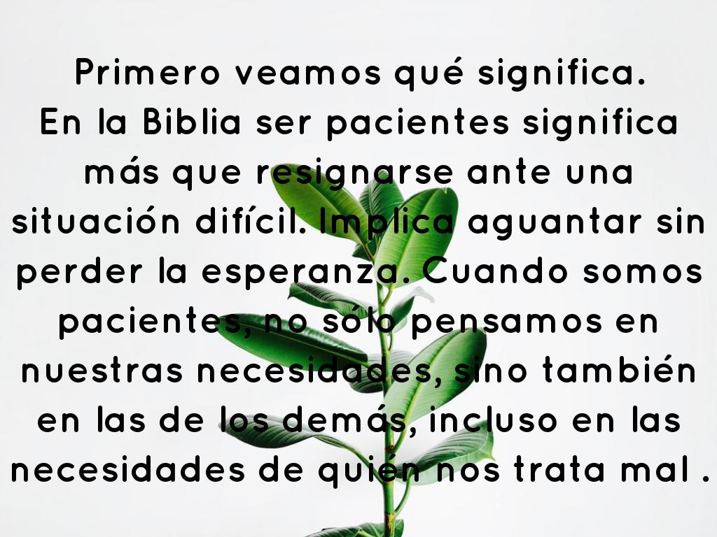 En la Biblia ser pacientes significa más que resignarse ante una situación difícil. Implica aguantar sin perder la esperanza. Cuando somos pacientes, no sólo pensamos en nuestras necesidades, sino también en las de los demás, incluso en las necesidades de quién nos trata mal .