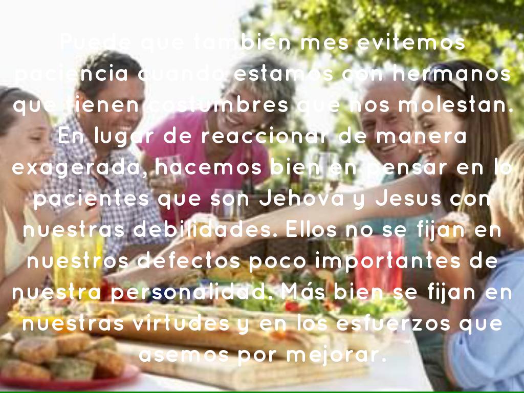 Puede que también mes evitemos paciencia cuando estamos con hermanos que tienen costumbres que nos molestan. En lugar de reaccionar de manera exagerada, hacemos bien en pensar en lo pacientes que son Jehova y Jesus con nuestras debilidades. Ellos no se fijan en nuestros defectos poco importantes de nuestra personalidad. Más bien se fijan en nuestras virtudes y en los esfuerzos que asemos por mejorar.