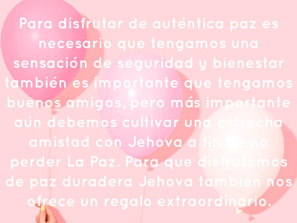 Para disfrutar de auténtica paz es necesario que tengamos una sensación de seguridad y bienestar también es importante que tengamos buenos amigos, pero más importante aún debemos cultivar una estrecha amistad con Jehova a fin de no perder La Paz. Para que disfrutemos de paz duradera Jehova también nos ofrece un regalo extraordinario.