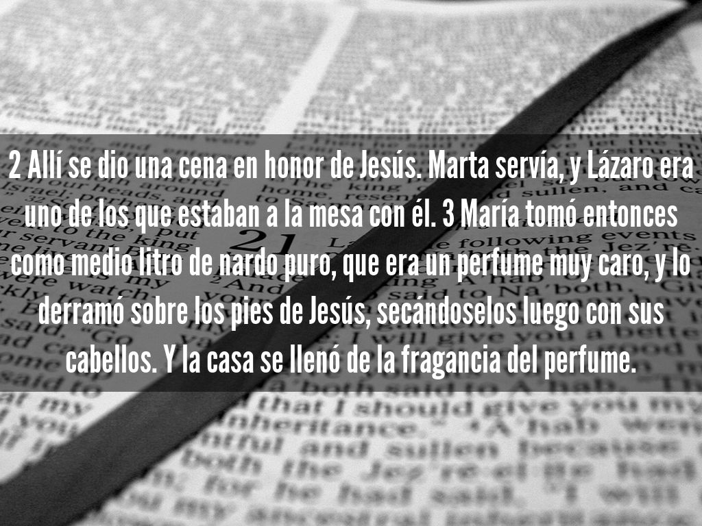 2 Allí se dio una cena en honor de Jesús. Marta servía, y Lázaro era uno de los que estaban a la mesa con él. 3 María tomó entonces como medio litro de nardo puro, que era un perfume muy caro, y lo derramó sobre los pies de Jesús, secándoselos luego con sus cabellos. Y la casa se llenó de la fragancia del perfume.